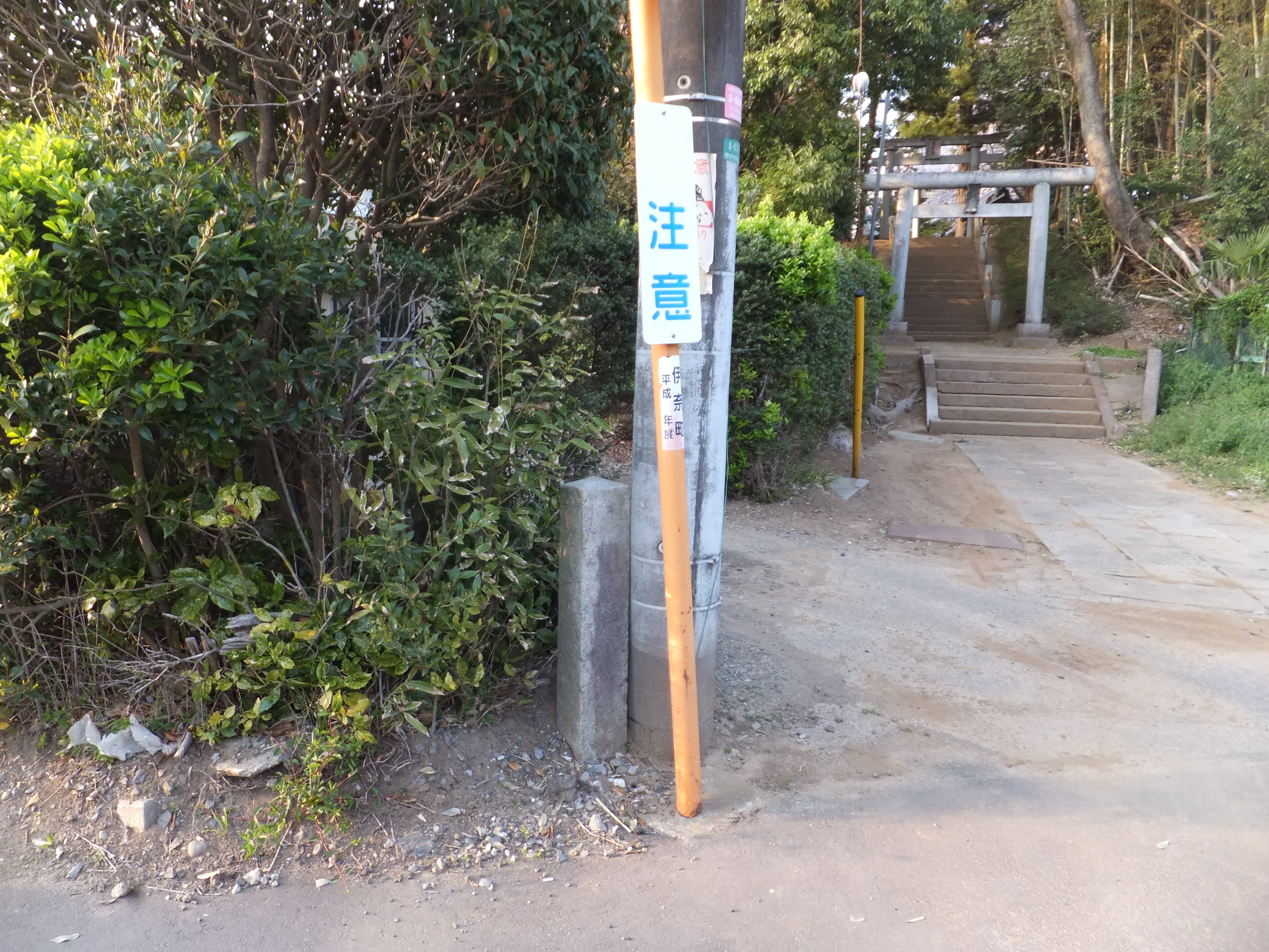 そのまま北上すると「陽光台 2 丁目東」交差点で r3 とぶつかるが、この交差点の前後の区間の r3 はみらい平地区の区画整理によって整備されたもので、それまでは存在していなかった。そして、その手前にある十字路が次のカギになる。その十字路を北東へ進むと r3 に合流しているが、現 r3 は「陽光台 2 丁目東」交差点の東側で北東に進路を変えており、北東の谷田部方面からくると、この交差点が直進方向になっている(さらに言えば、この直進ルートは迅速図と一致する)。そして、この交差点の北西角の電柱の根本に、道標があるのだ。