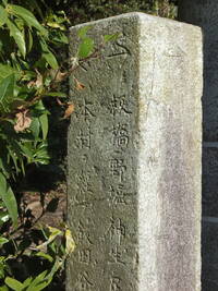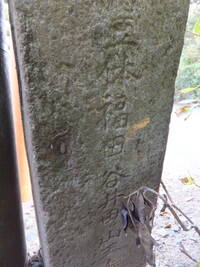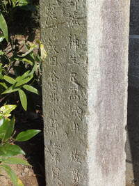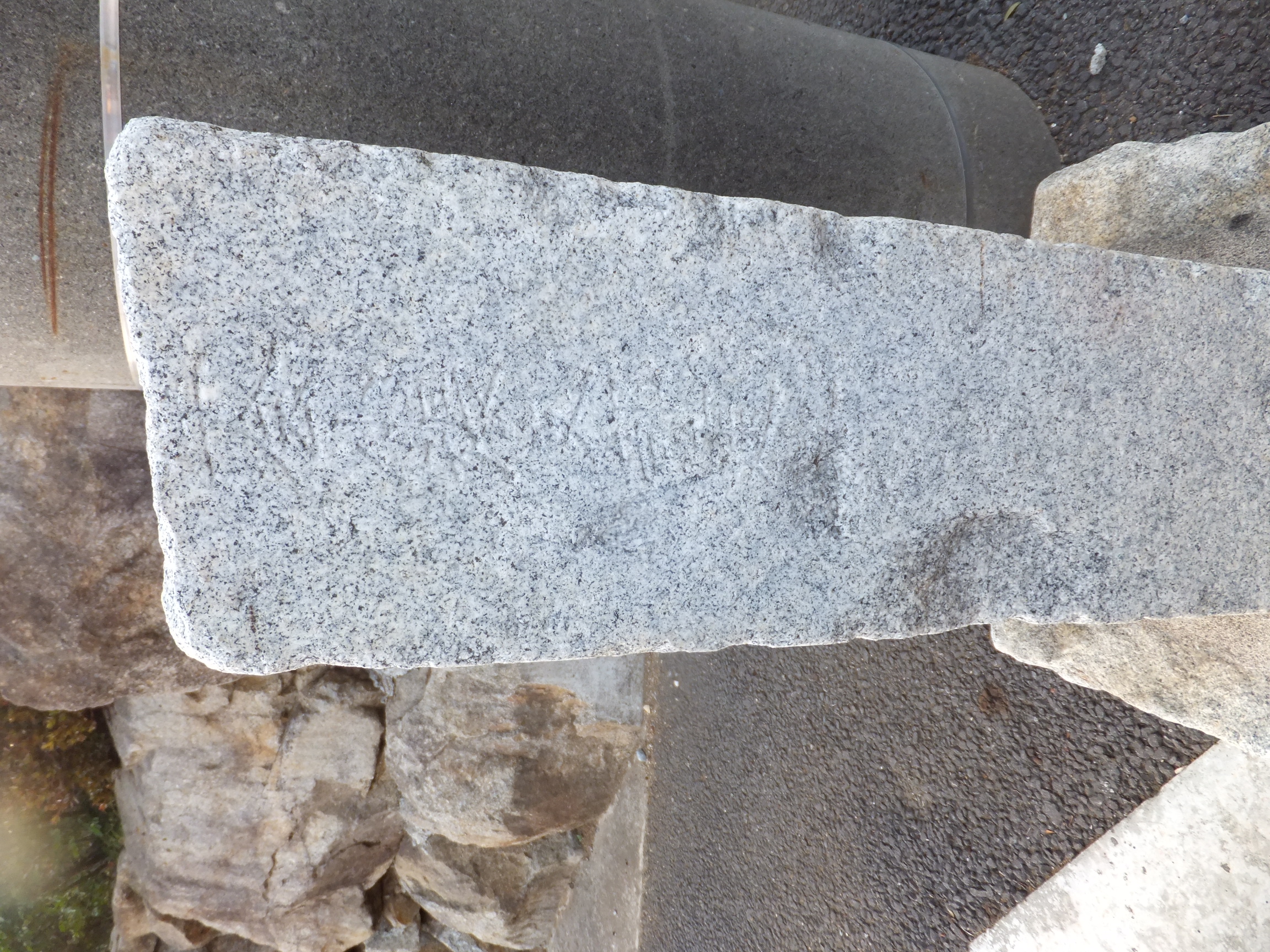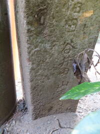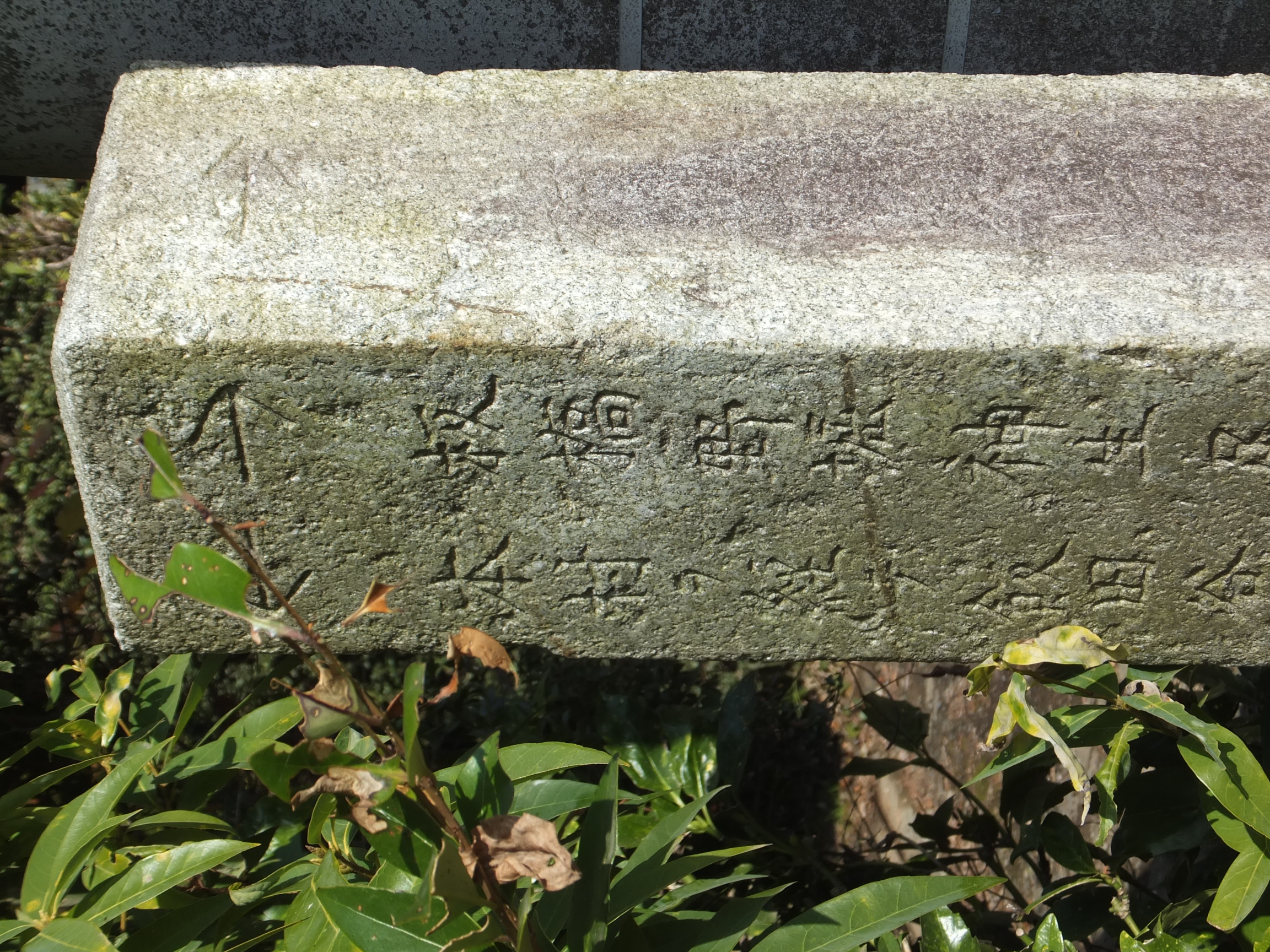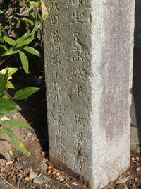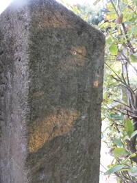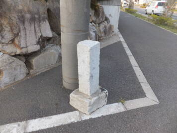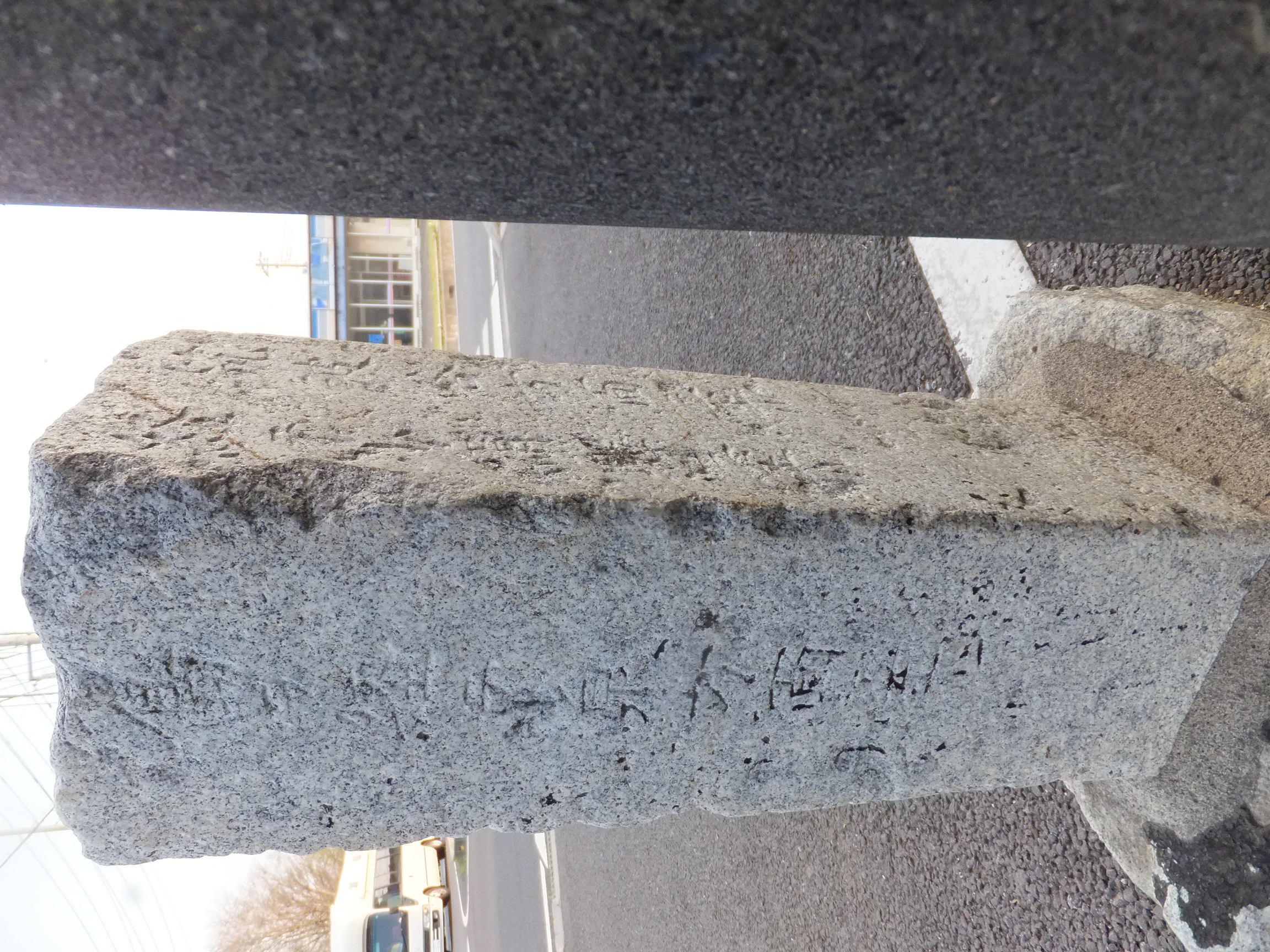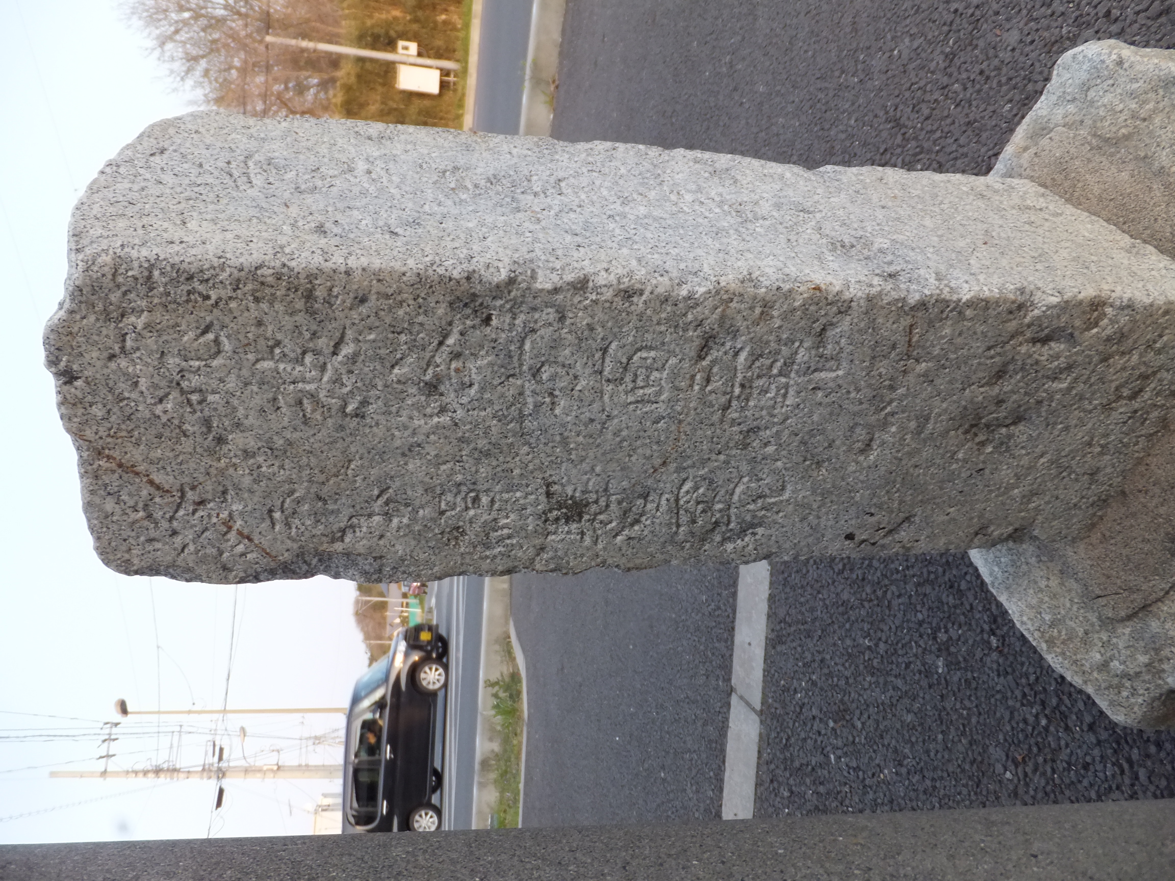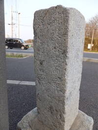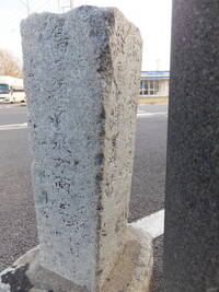 この道標、実際にどこにあったのかが今ひとつわからない。というのも、地面から生えておらず、一見土台に見える重しが付いていて、路面上に置かれているのだ。さらに、実は上部がボッキリ折れていて、刻まれていた文字列の上半分が失われてしまっている。おそらく、半分埋没した状態になっていたものの上部をそれと知らずに重機などで削り取り、そのあとで道標が埋まっていたことに気付いたものの既に上部が行方不明になったか粉砕されてしまっており、せめて残存部分だけでもと重しを兼ねた「足」を付けて交差点の角に置いたのではないだろうか。