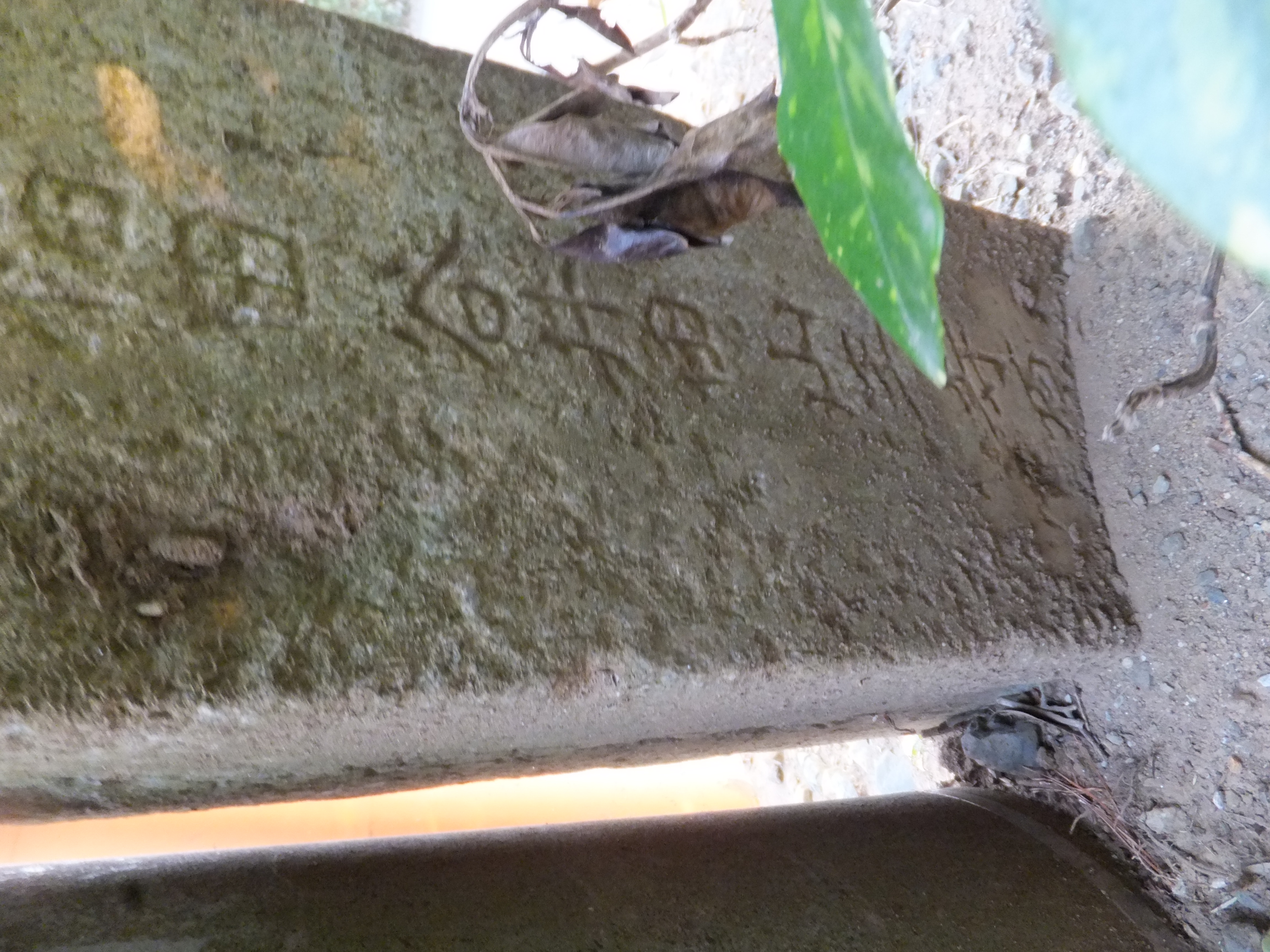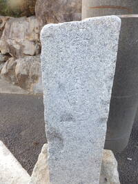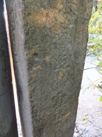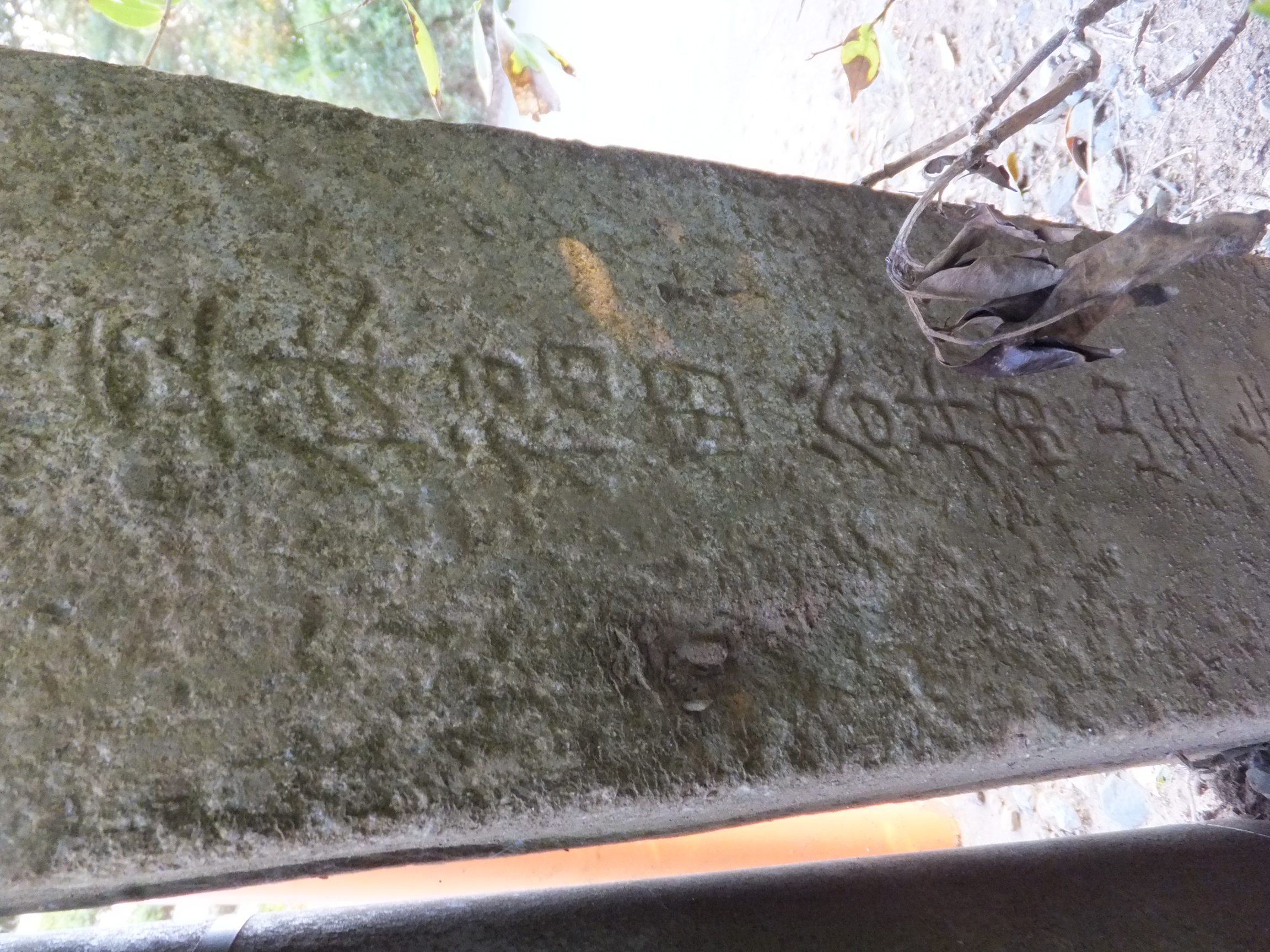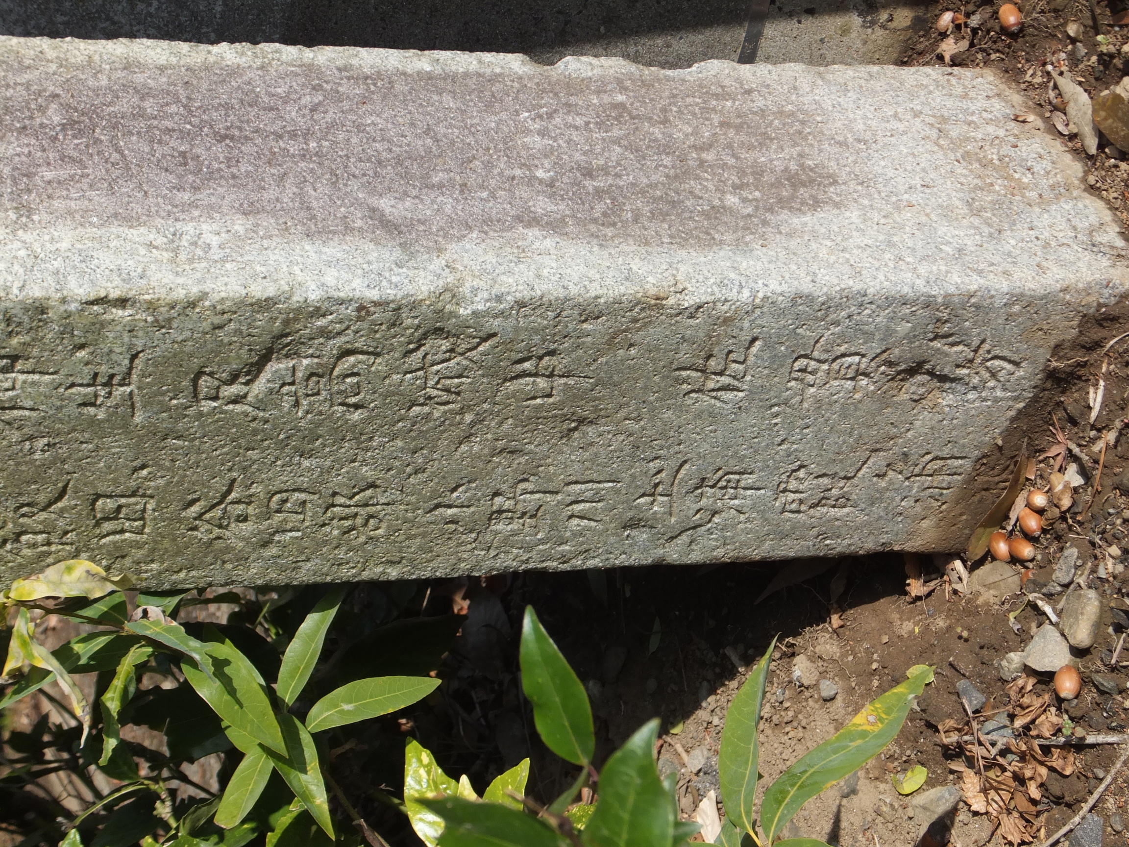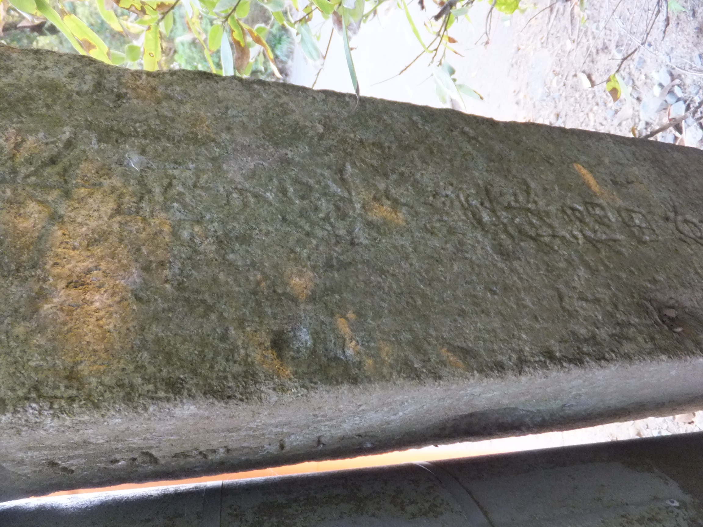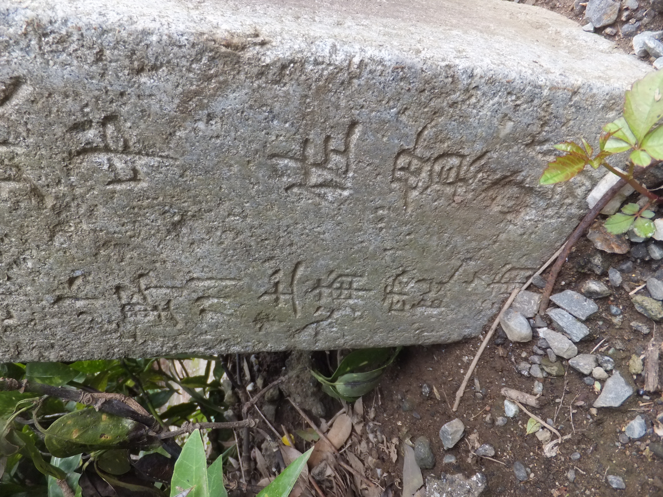 この道標、実際にどこにあったのかが今ひとつわからない。というのも、地面から生えておらず、一見土台に見える重しが付いていて、路面上に置かれているのだ。さらに、実は上部がボッキリ折れていて、刻まれていた文字列の上半分が失われてしまっている。おそらく、半分埋没した状態になっていたものの上部をそれと知らずに重機などで削り取り、そのあとで道標が埋まっていたことに気付いたものの既に上部が行方不明になったか粉砕されてしまっており、せめて残存部分だけでもと重しを兼ねた「足」を付けて交差点の角に置いたのではないだろうか。
